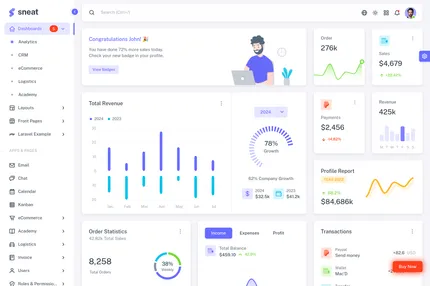 Sneat Dashboard FREE is a developer-friendly Laravel 11 admin panel that is rich with features and highly customizable.